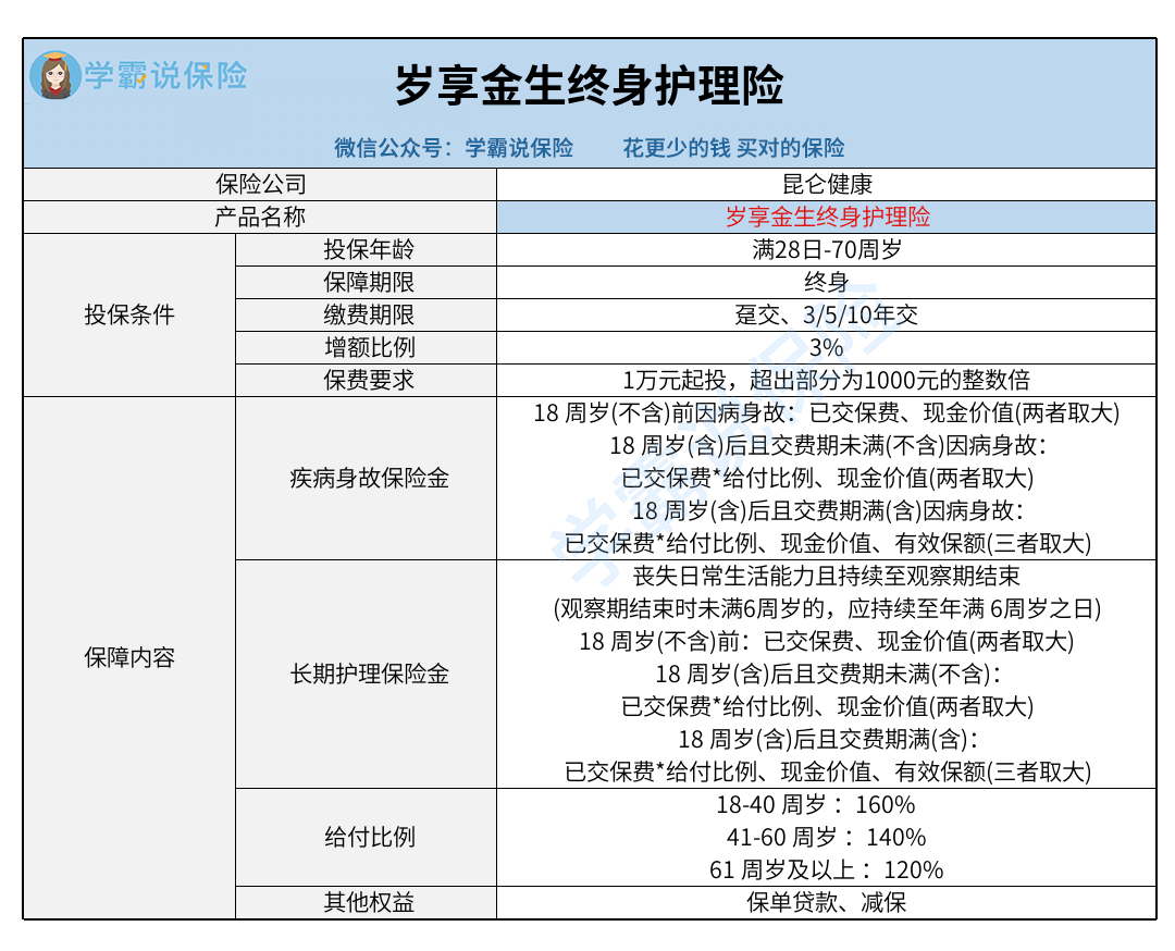 而今天学姐为大家带来的岁享金生终身护理险,不仅提供护理保障,还有一定的理财功能。