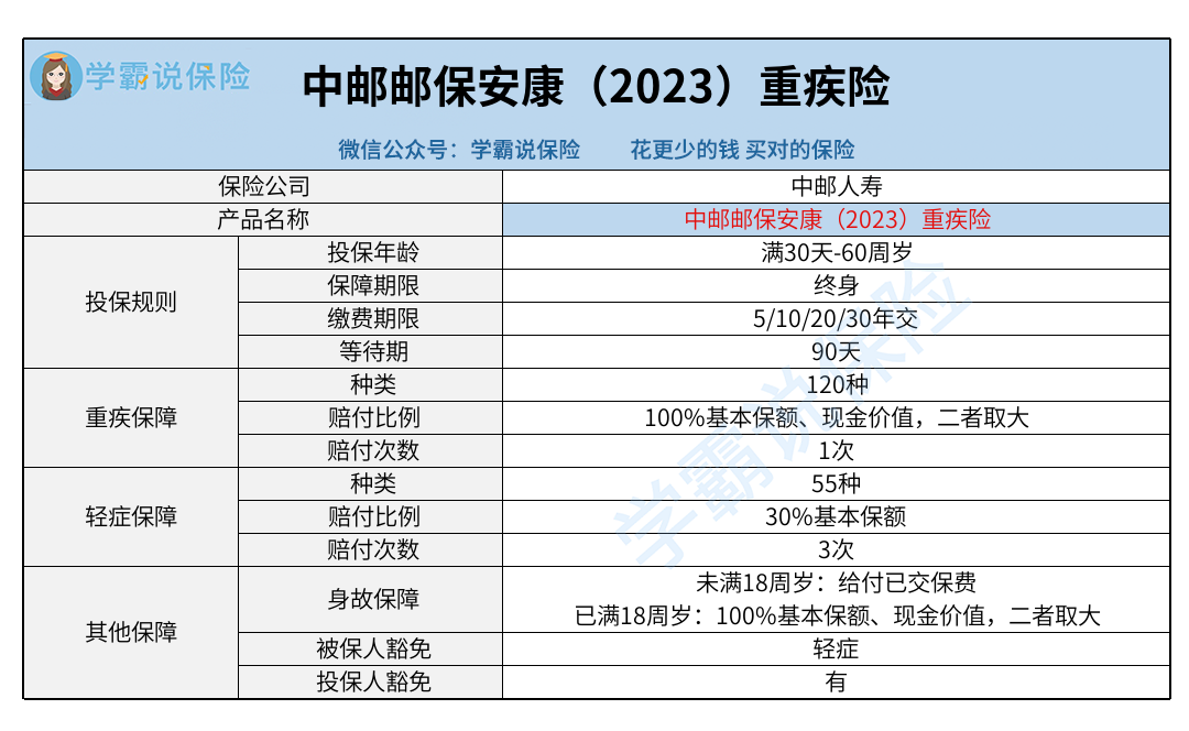 今天,学姐则为大家带来一款重疾险产品,为中邮人寿推出的中邮邮保安康(2023)重疾险。